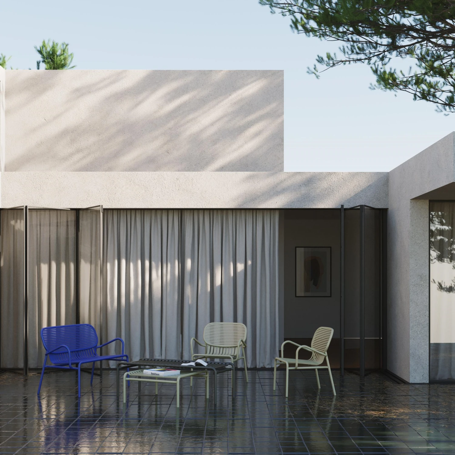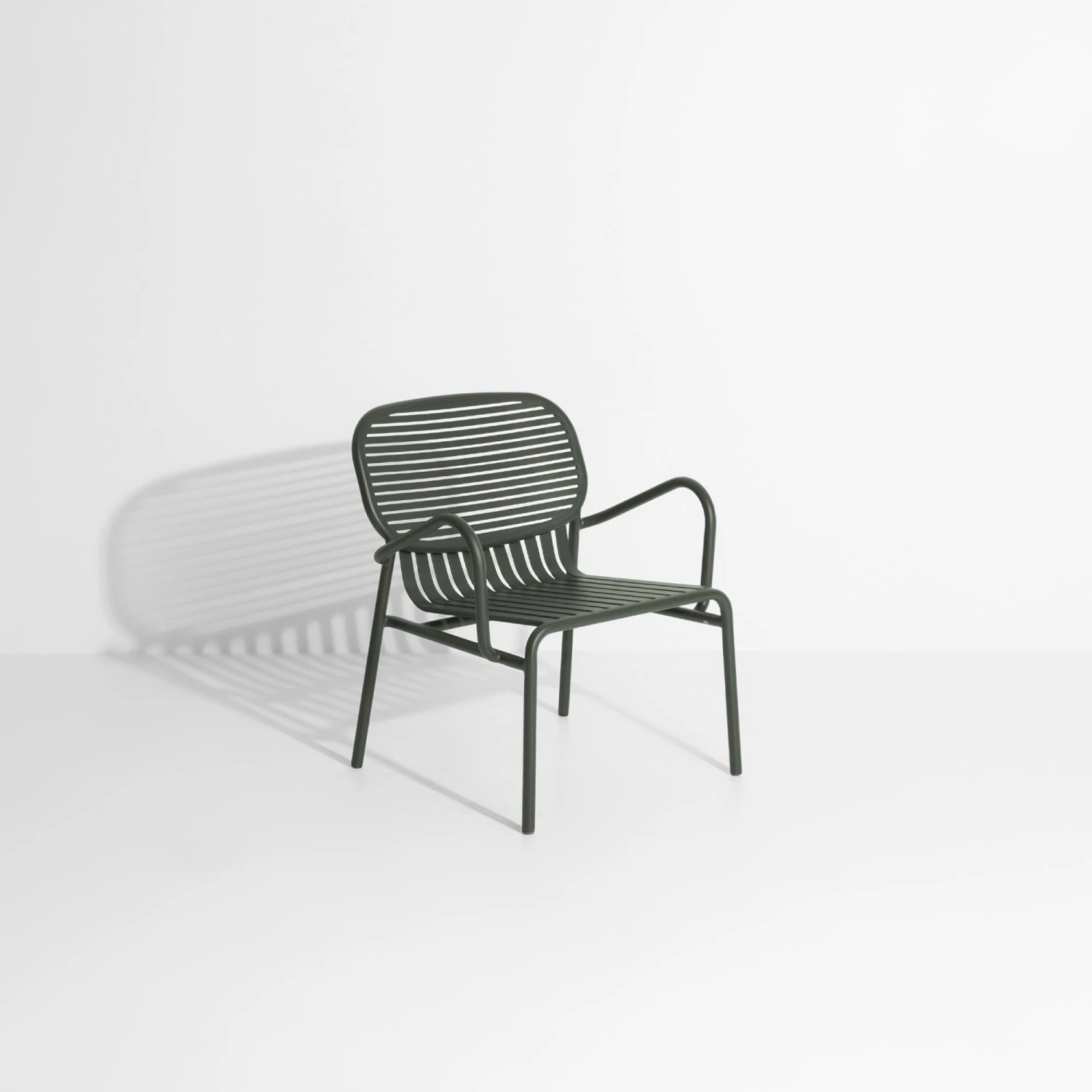 Concept: Week-End from Petite Friture is a series of outdoor furniture that, with its slats, creates a feeling of airiness and identity. All furniture is powder coated with a paint that makes them resistant to UV rays, water and the humidity of the sea air. The detailed furniture plays with horizontal and vertical lines and creates a striped design that emphasizes the lightness and elegance of the iconic design. With a mixture of fixed shapes and soft curves, the Week-End series is an obvious choice when choosing furniture for the outdoor area, regardless of whether the need is for a café set, dining area or a relaxed lounge atmosphere. All furniture is available in a range of attractive colours, which can be combined or ensure a more uniform appearance and beautiful cohesion.